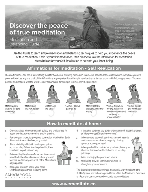 A complete black and white guide to the basic techniques of Sahaja Yoga, Shri Mataji, the Subtle System, and advice for meditating at home.