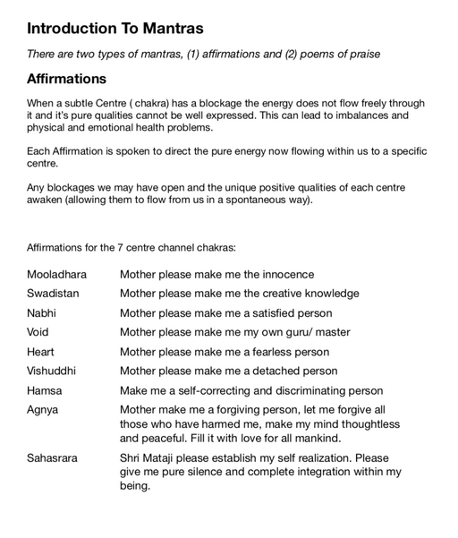 A two-page sheet for teaching mantras and affirmations in public programs.