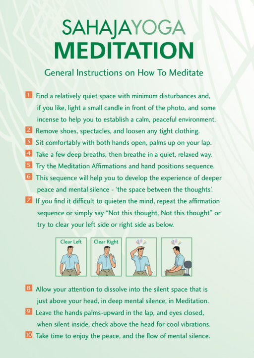 A meditate at home tri-fold in the classic green style, including basic details on the subtle system, a page on Shri Mataji and basic clearing techniques.